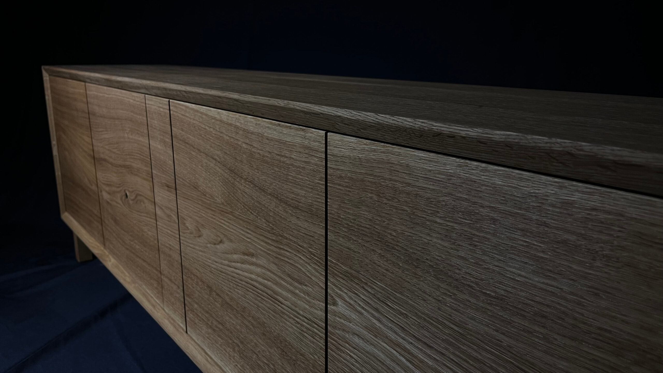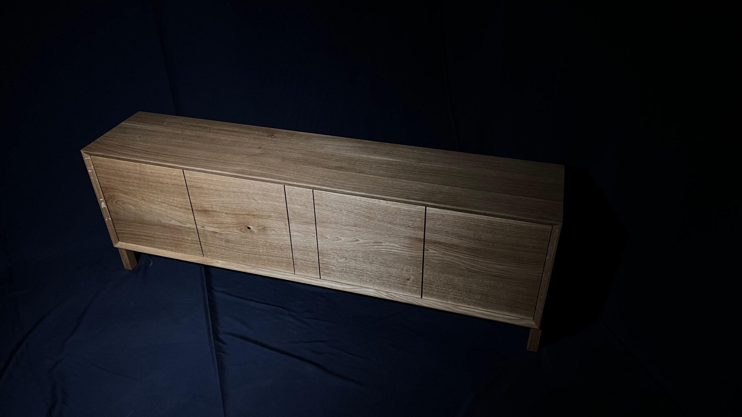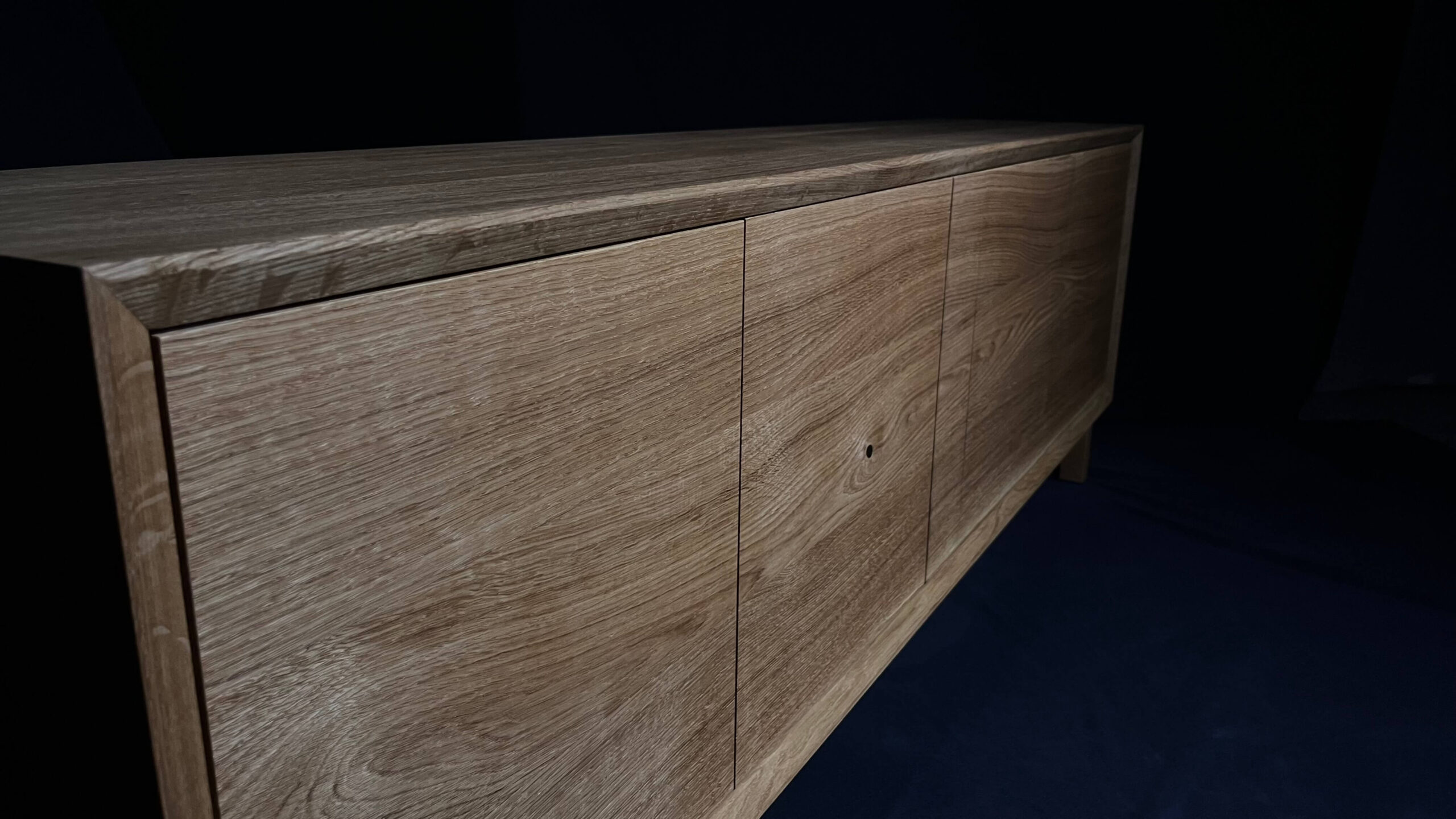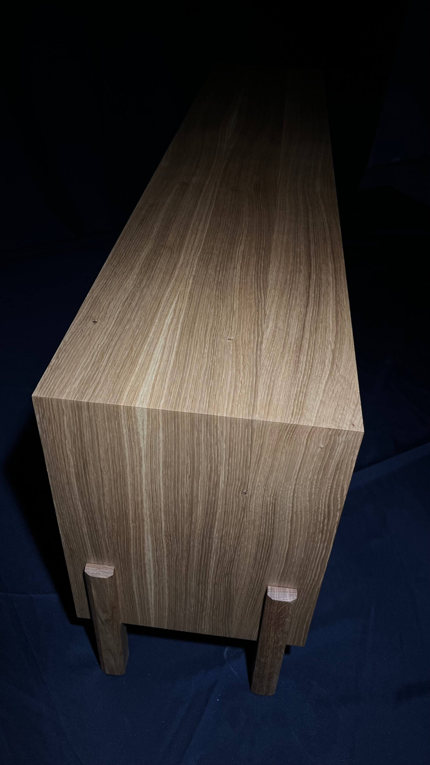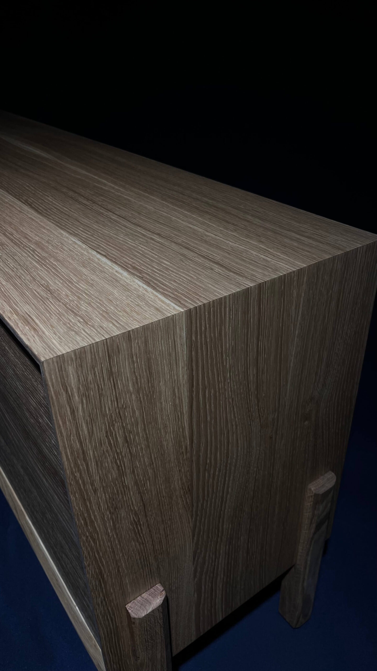 Minimalistická komoda z masivního dubu, jejíž čelní plocha i korpus jsou vyřezány z jedné desky. Díky tomu na sebe letokruhy plynule navazují a vytvářejí přirozený, ničím nerušený celek. Tento na pohled jednoduchý detail je výsledkem pečlivého plánování, zkušenosti a precizní řemeslné práce.