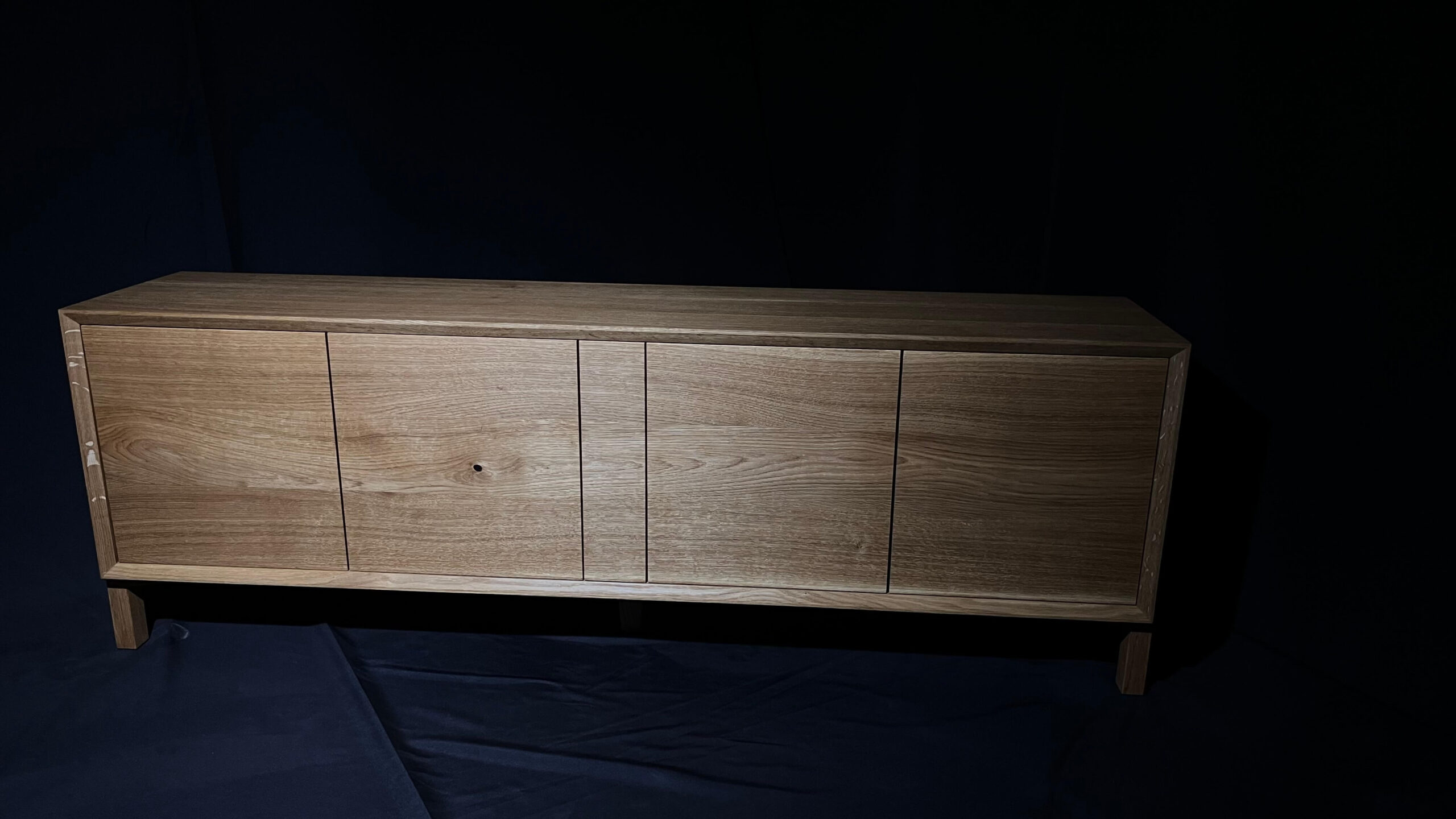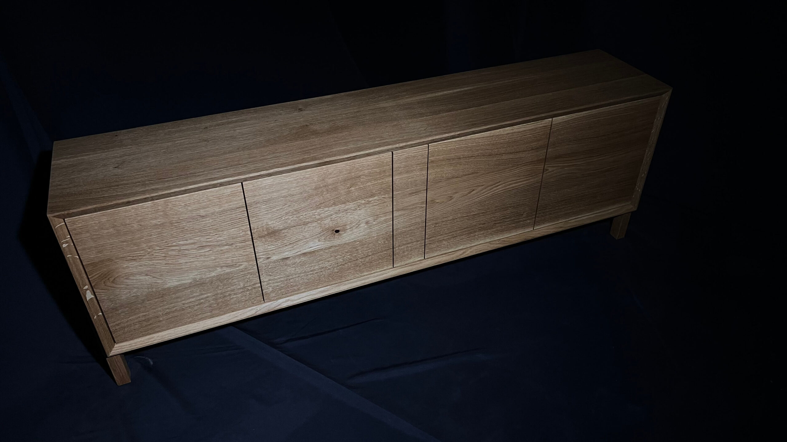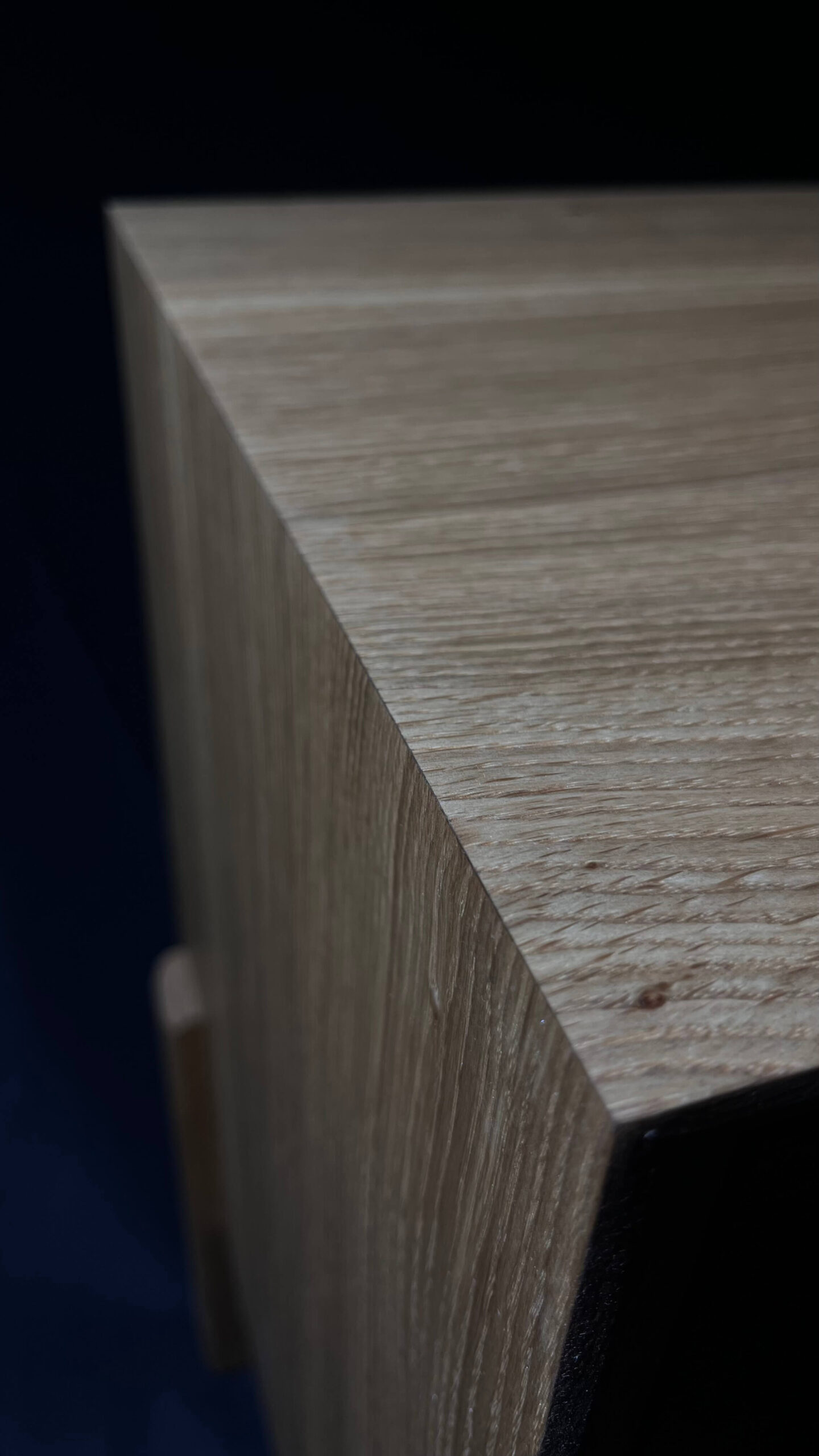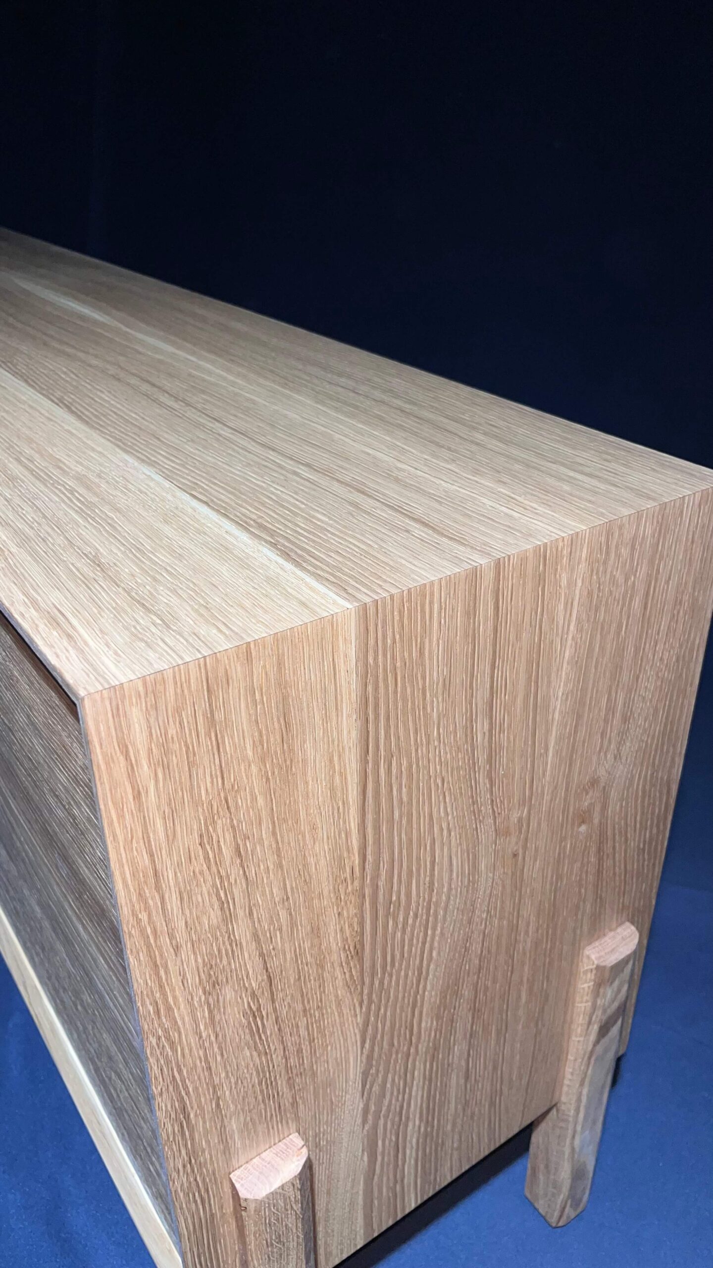 Minimalistická komoda z masivního dubu, jejíž čelní plocha i korpus jsou vyřezány z jedné desky. Díky tomu na sebe letokruhy plynule navazují a vytvářejí přirozený, ničím nerušený celek. Tento na pohled jednoduchý detail je výsledkem pečlivého plánování, zkušenosti a precizní řemeslné práce.