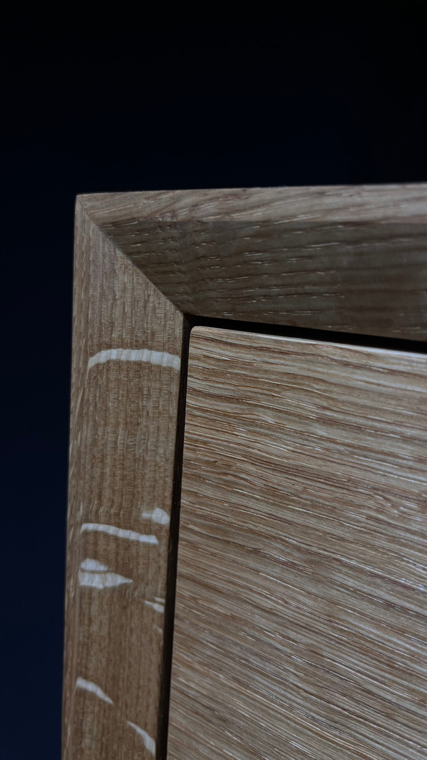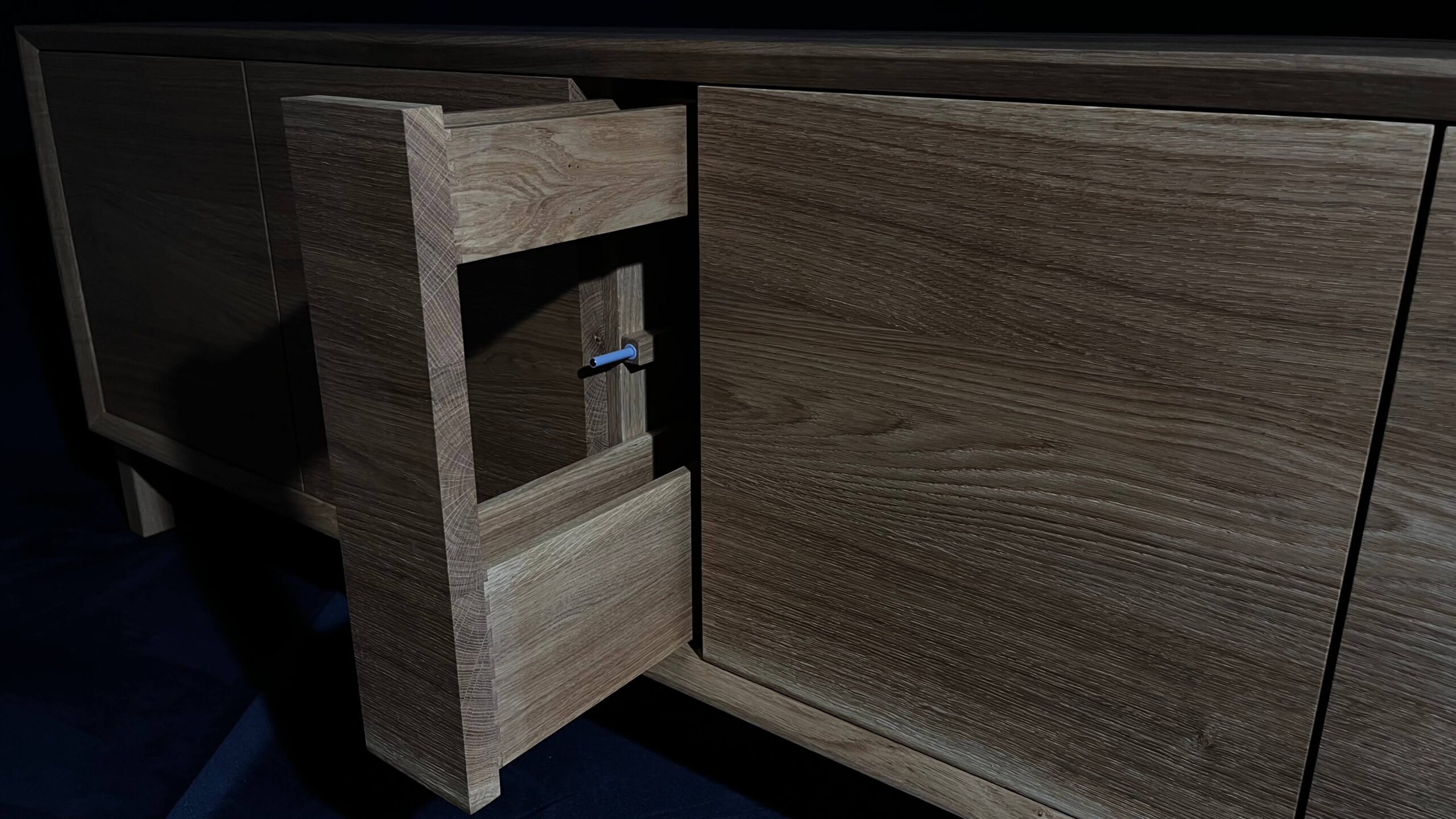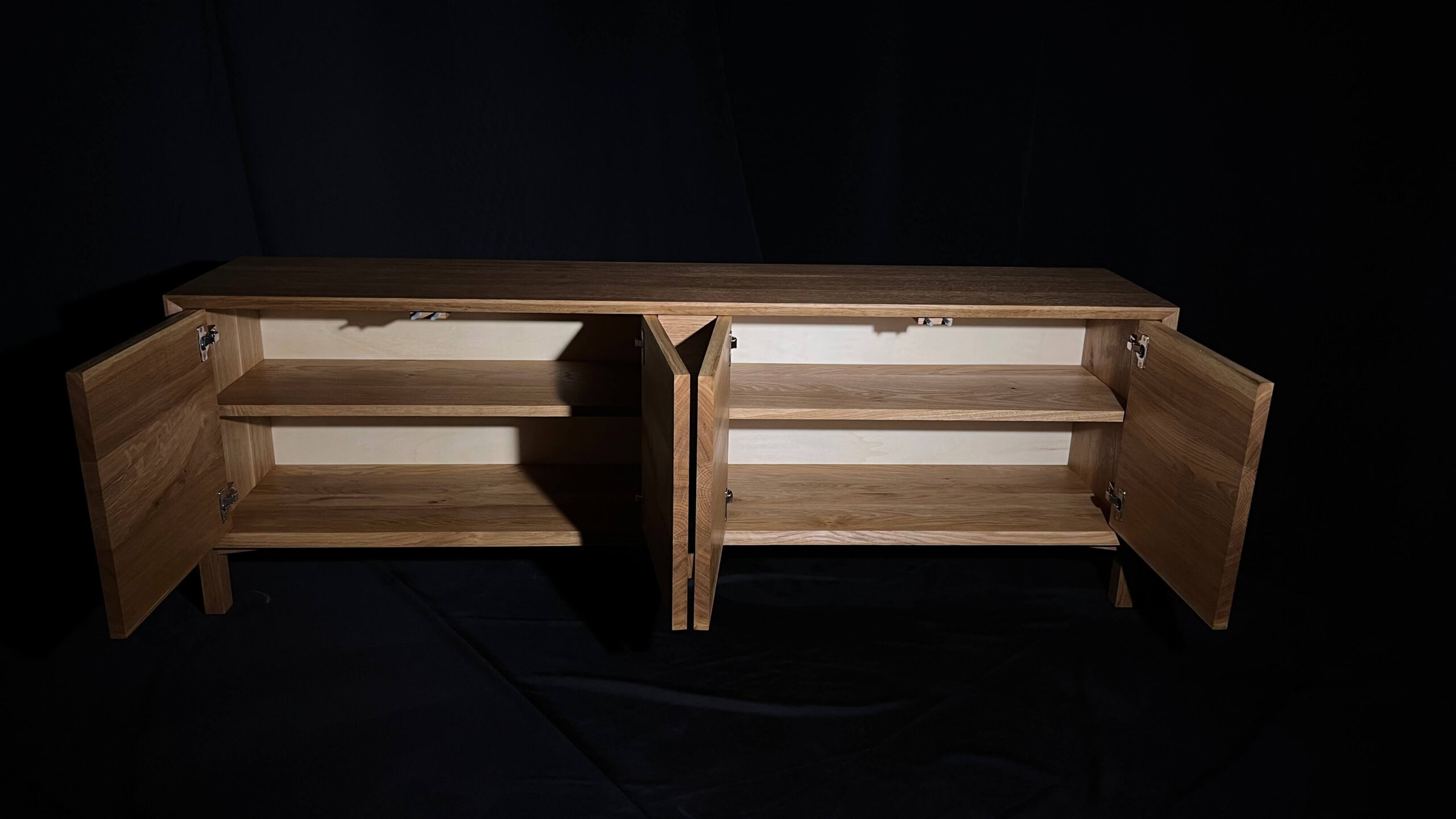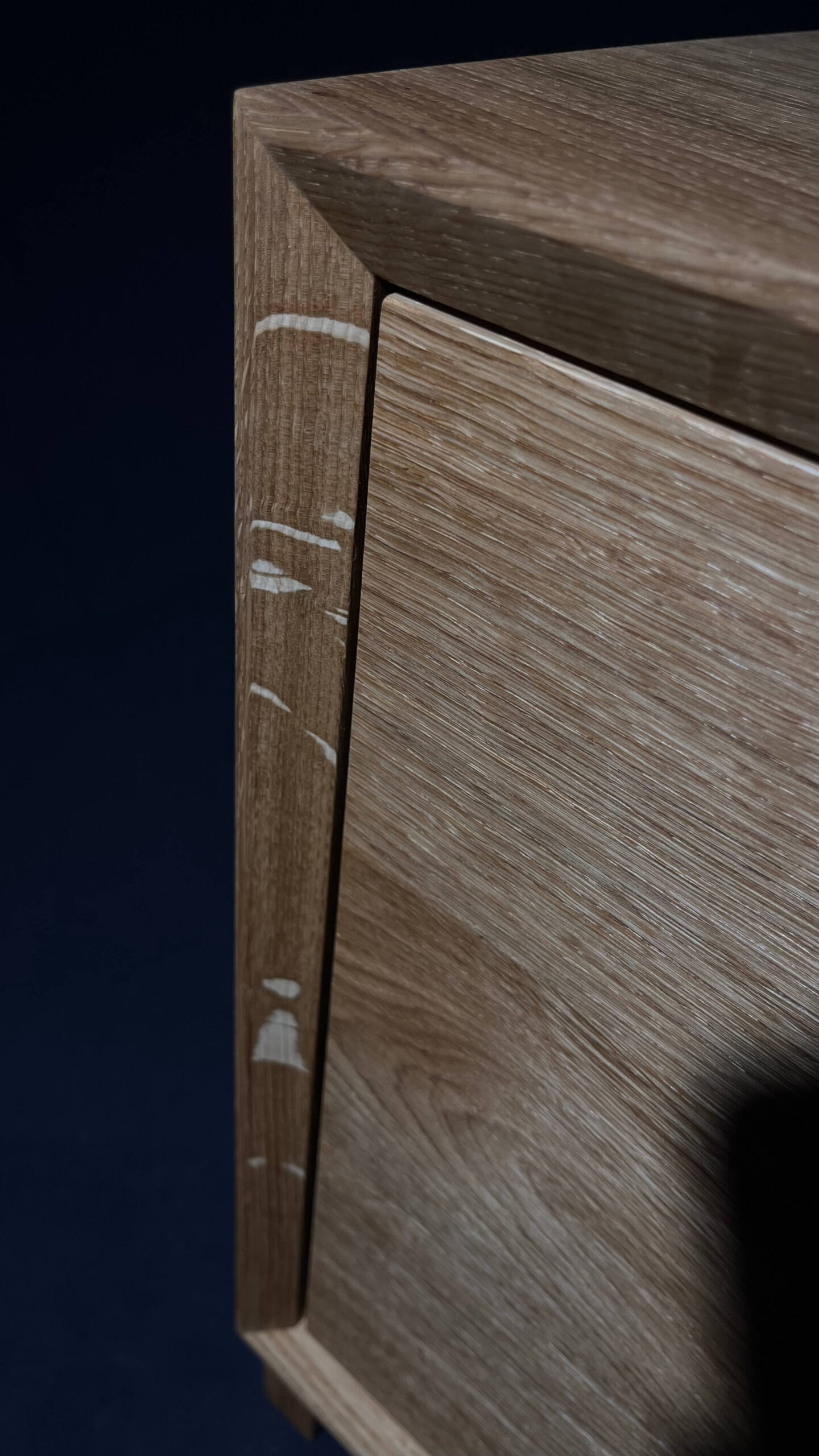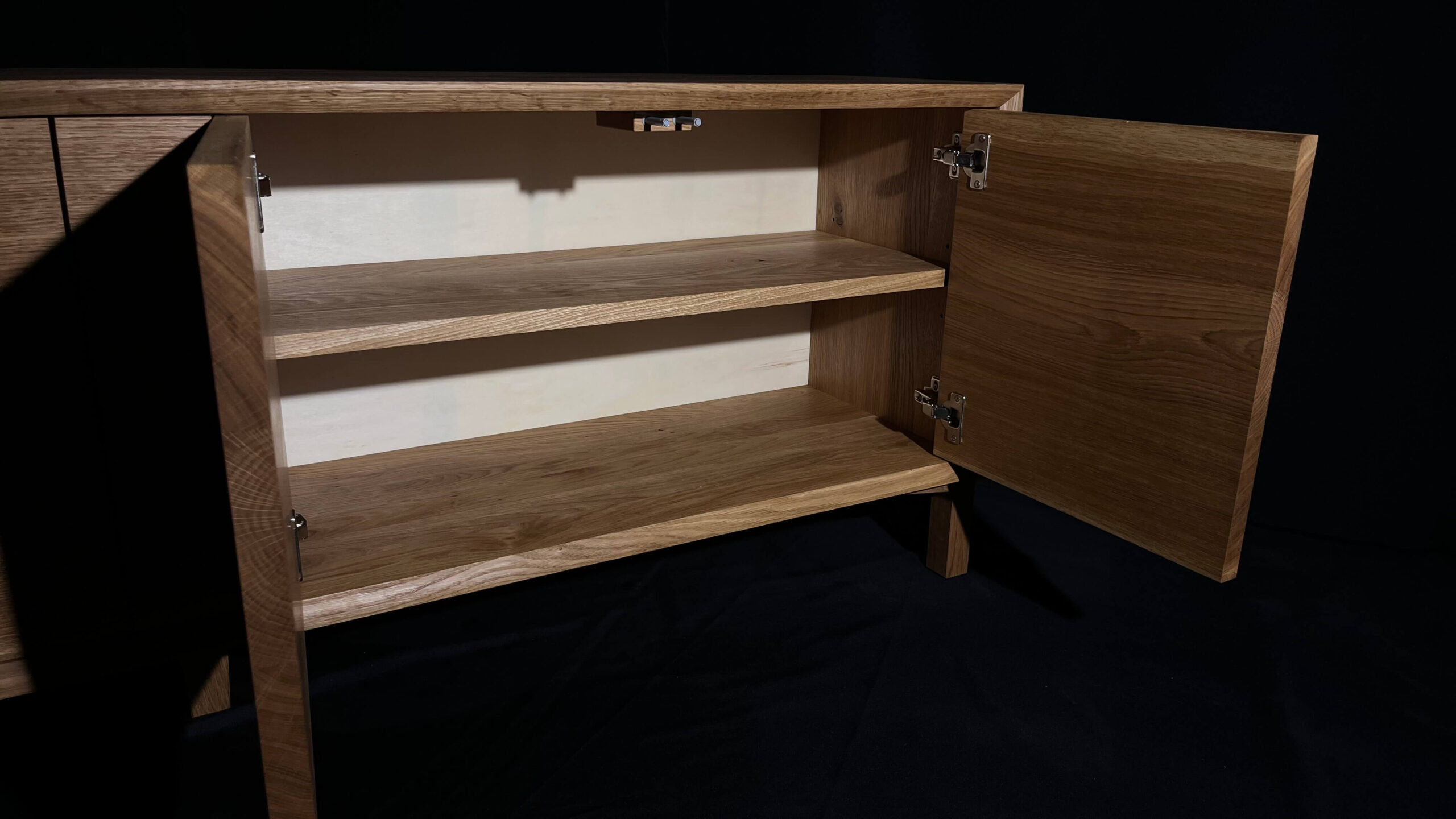 Minimalistická komoda z masivního dubu, jejíž čelní plocha i korpus jsou vyřezány z jedné desky. Díky tomu na sebe letokruhy plynule navazují a vytvářejí přirozený, ničím nerušený celek. Tento na pohled jednoduchý detail je výsledkem pečlivého plánování, zkušenosti a precizní řemeslné práce.