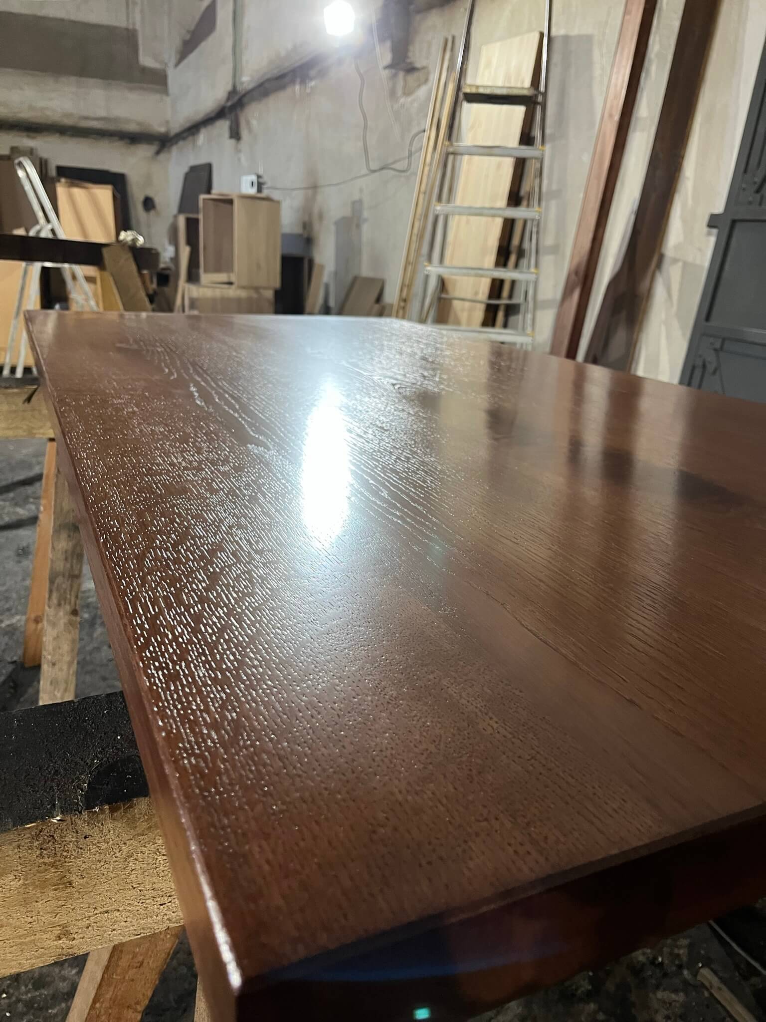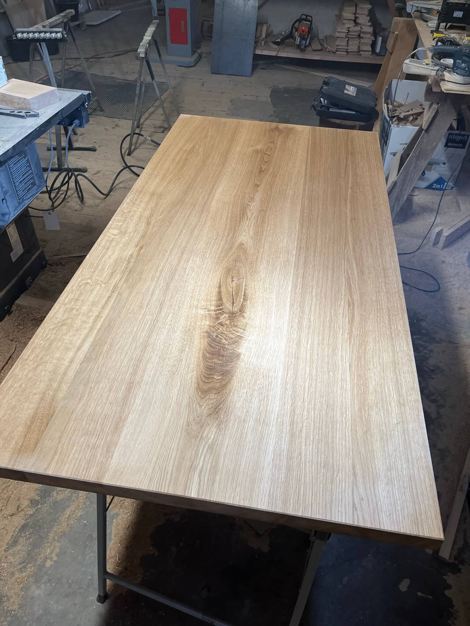 Minimalistická stolová deska s čistými liniemi a jemně zkosenými hranami. Střed desky zdobí výrazný velký suk, který se stává přirozenou dominantou celého stolu. Na přání zákazníka bylo použito mořidlo pro úpravu odstínu a finální lak pro zvýšení odolnosti. Přírodní charakter dřeva v kombinaci s jednoduchým zpracováním vytváří elegantní a nadčasový prvek do moderního interiéru.