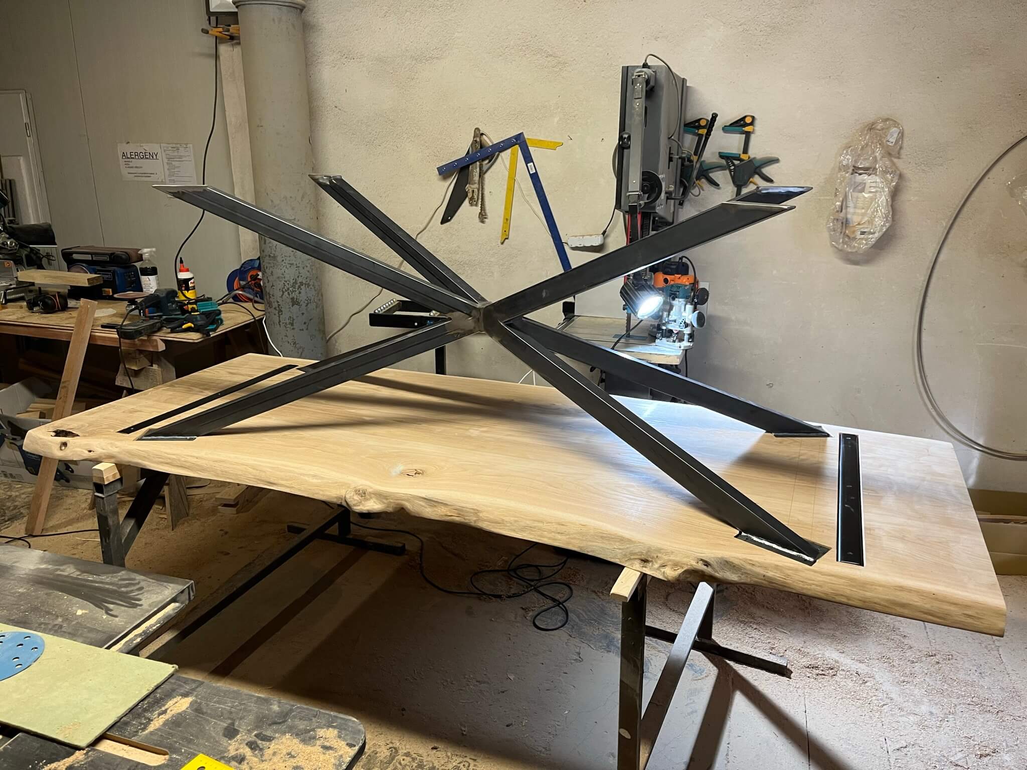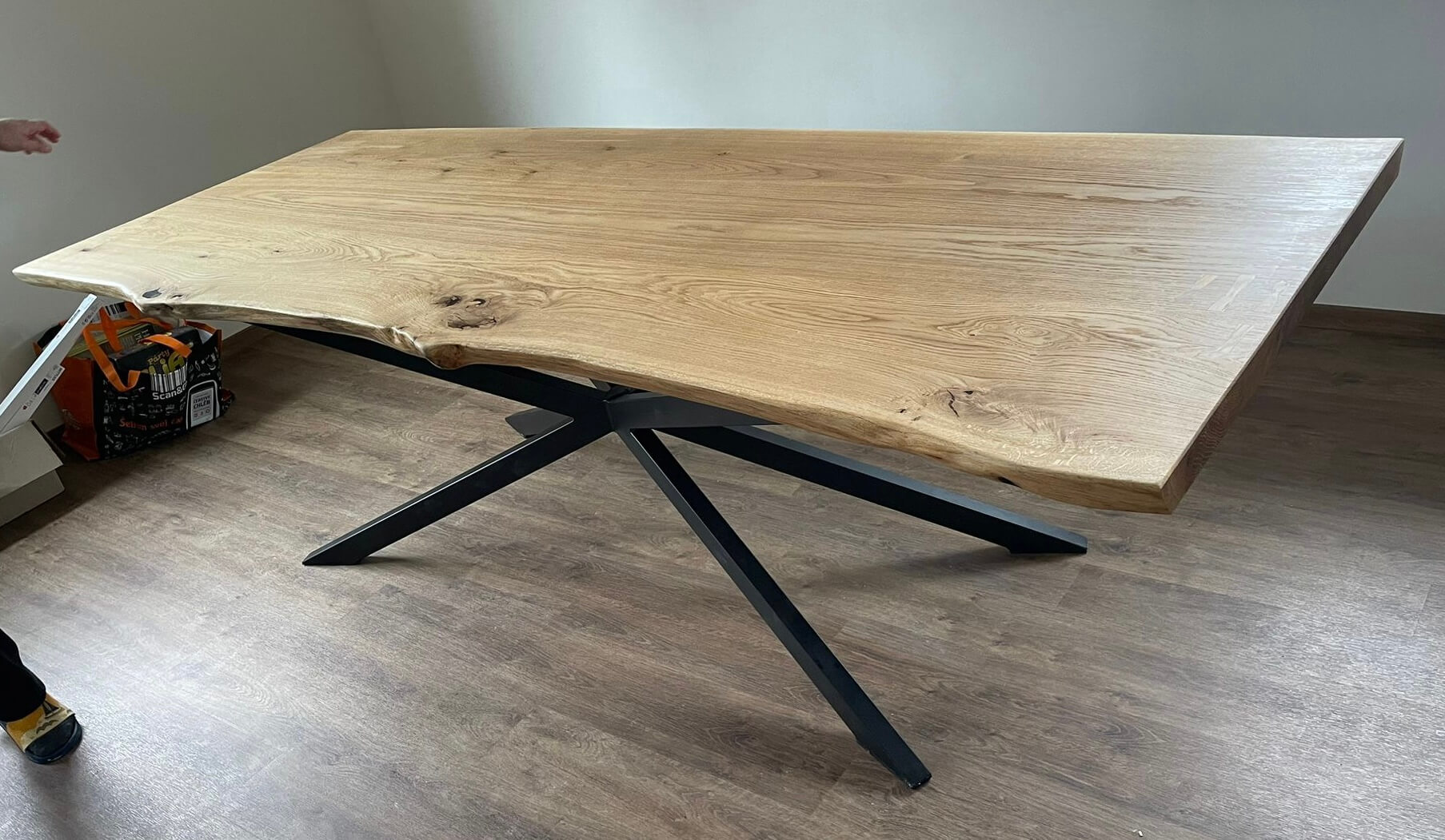 Robustní stůl s výraznou dubovou deskou a kovovou podnoží ve tvaru X.