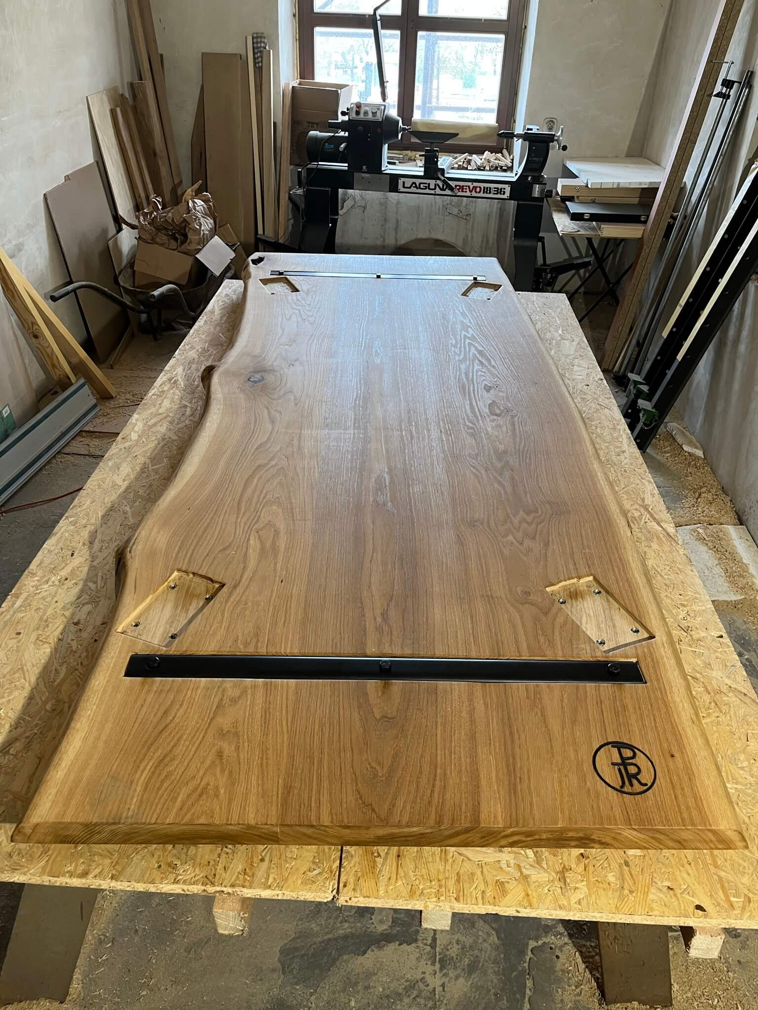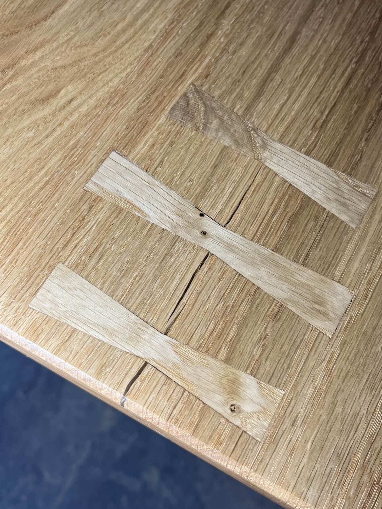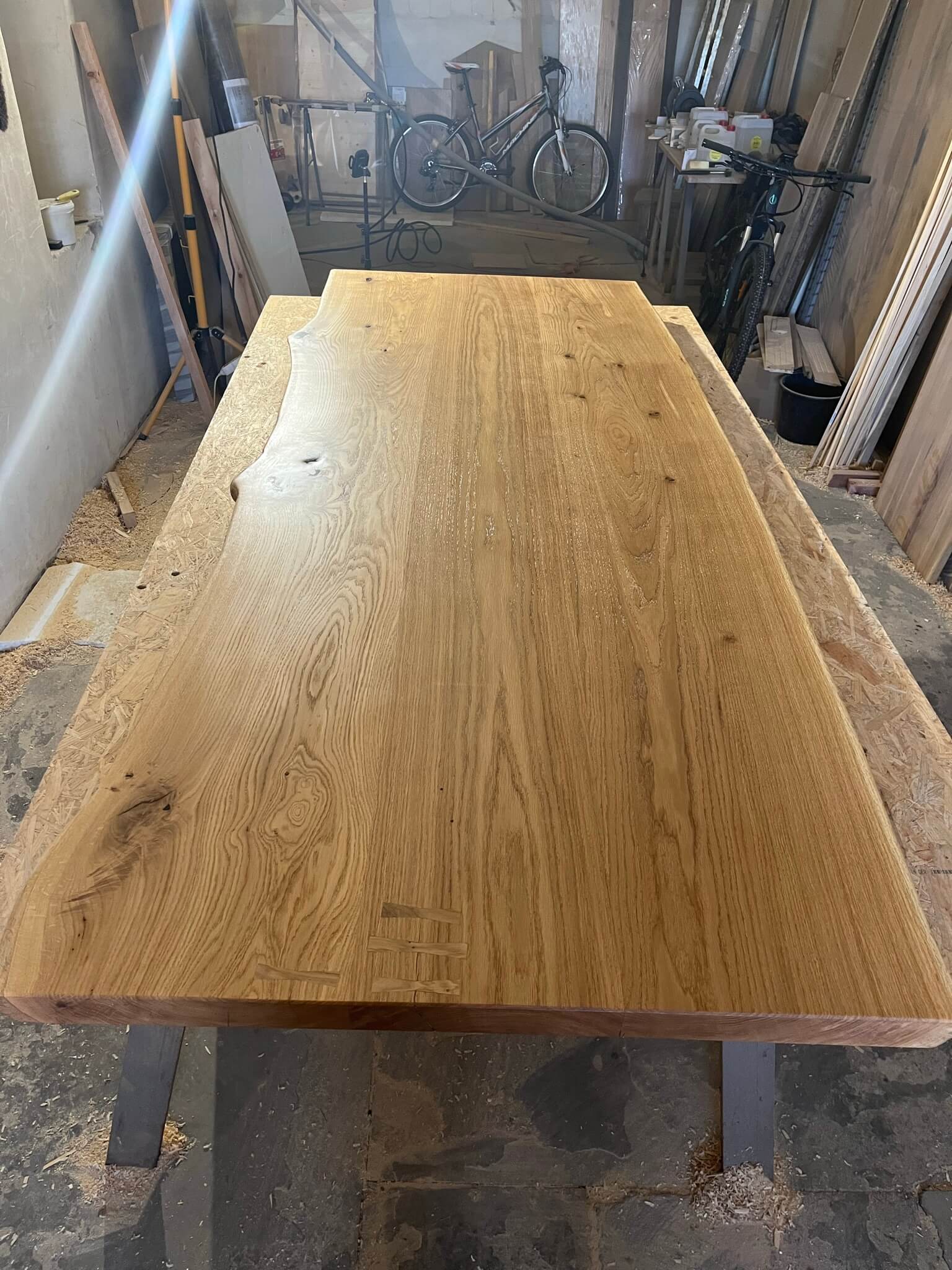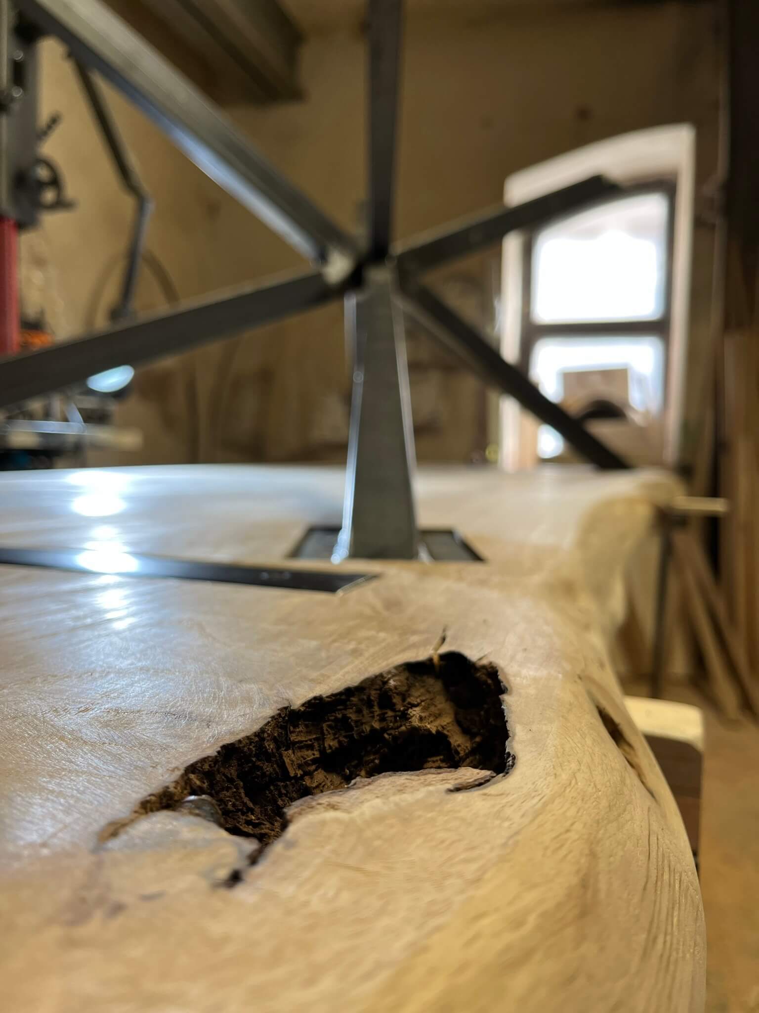 Praskliny jsou zpevněné tradičními dřevěnými mašlemi (bowtie inlay) – technický prvek, který zároveň slouží jako estetický detail. Suky jsou zalité čirou epoxidovou pryskyřicí, díky čemuž zůstává jejich struktura viditelná a stůl odolný.