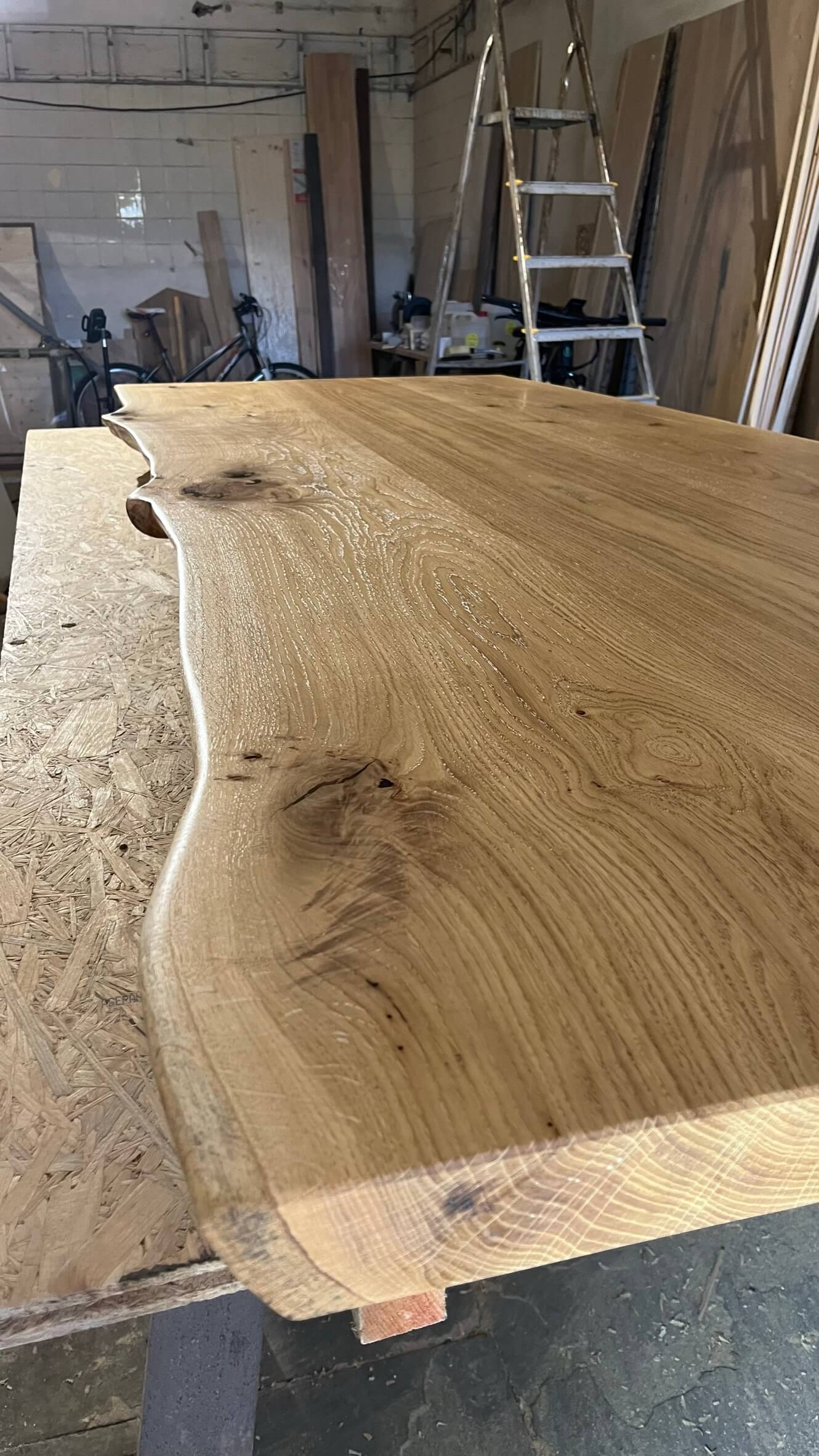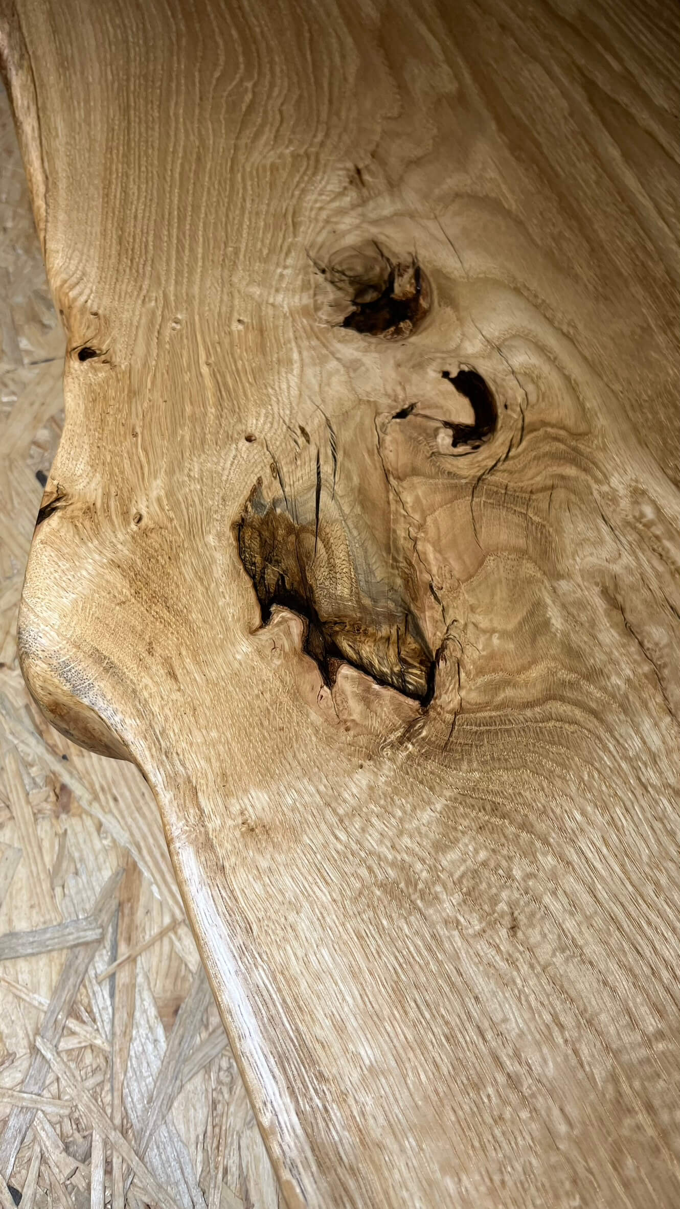 Deska o síle 7 cm působí masivně, ale přirozeně – vyniká kresbou dřeva, suky a živým okrajem (live edge), který zachovává autentický charakter materiálu.