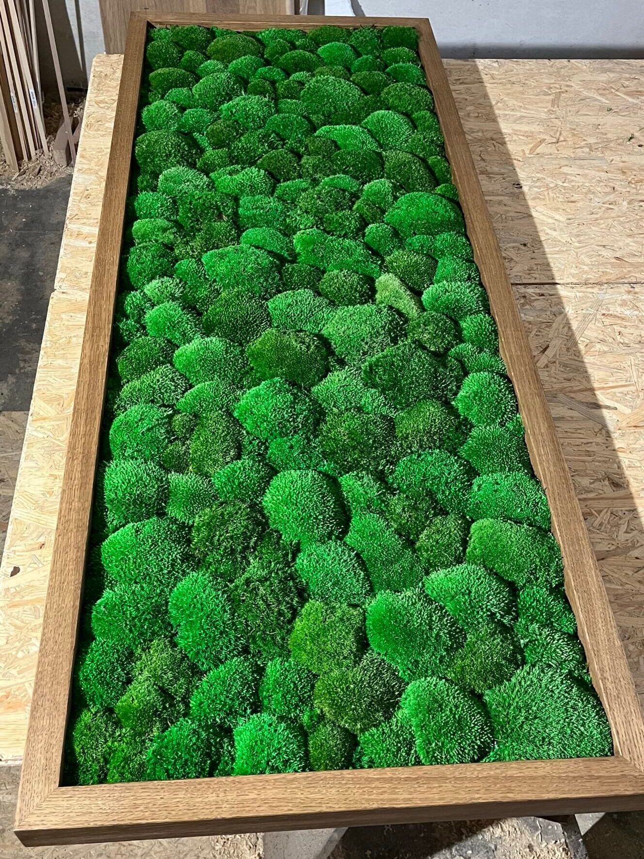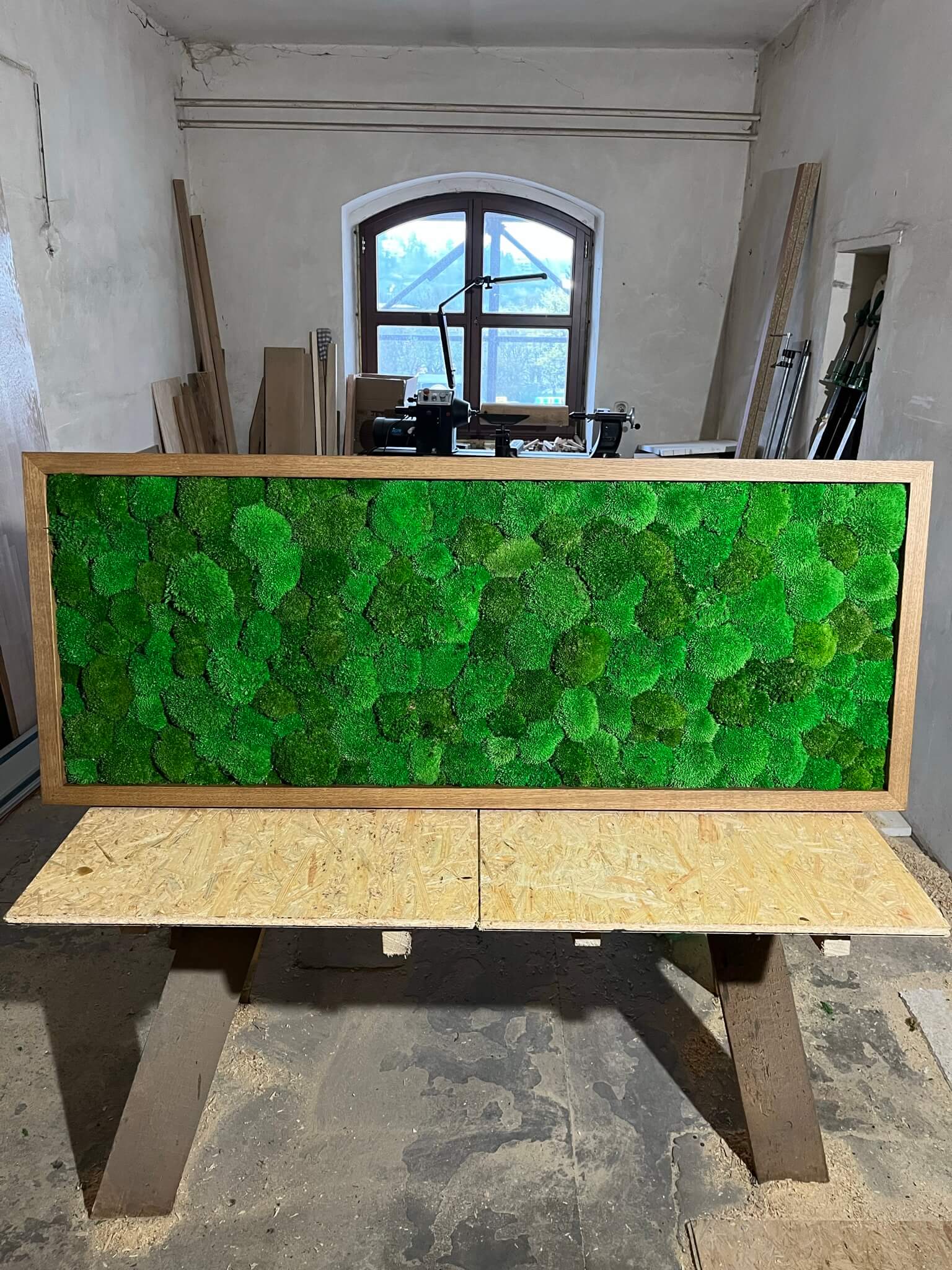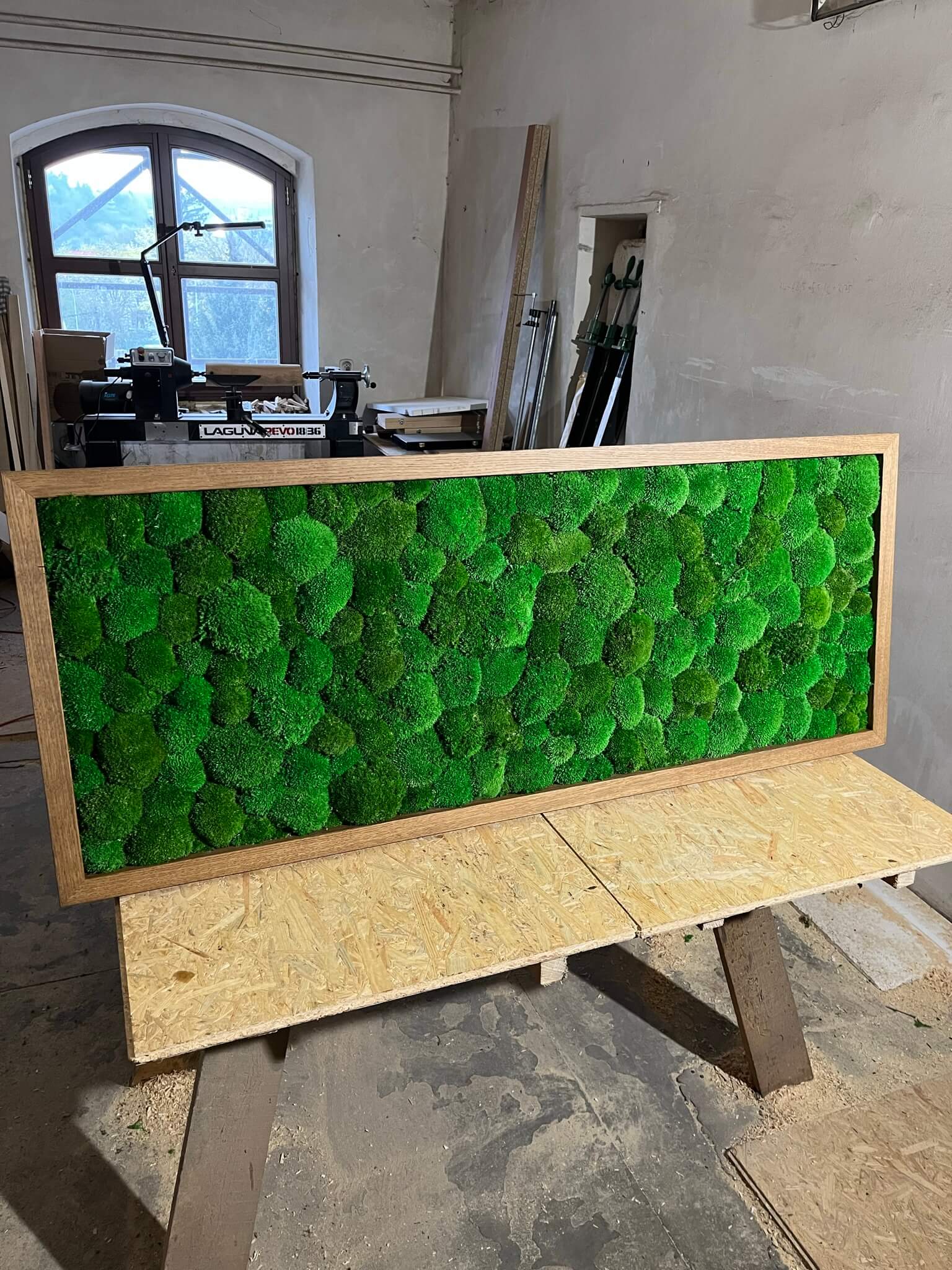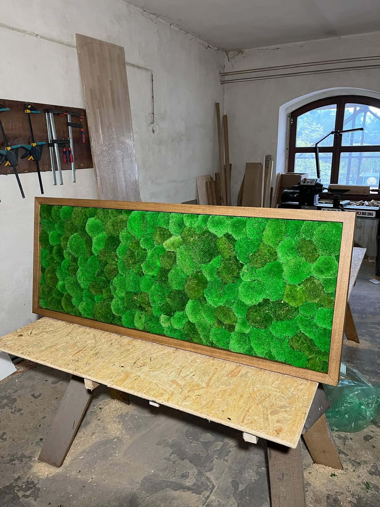 Originální přírodní dekorace pro váš interiér. Masivní dubový rám dodává obrazu pevnost a eleganci, zatímco vnitřní plocha je bohatě vyplněna bochánky stabilizovaného mechu, které si zachovávají svou svěžest a jemnost bez nutnosti další péče. Každý obraz je jedinečný a přináší do prostoru kus přírody, klid a harmonii. Skvěle se hodí do moderních i rustikálních interiérů, kanceláří, vstupních hal nebo obývacích pokojů.