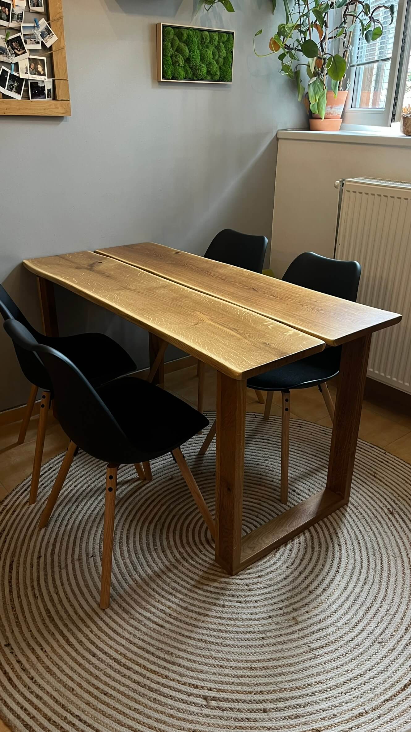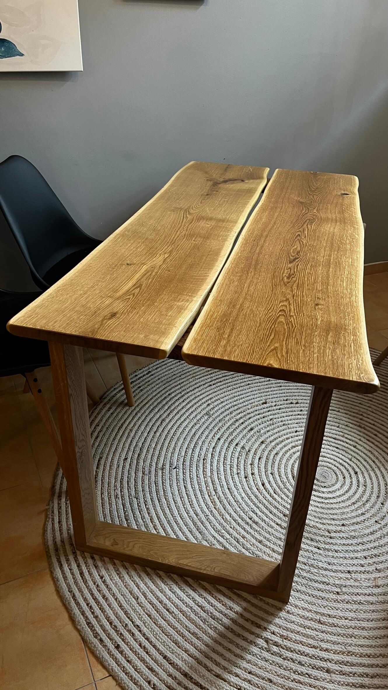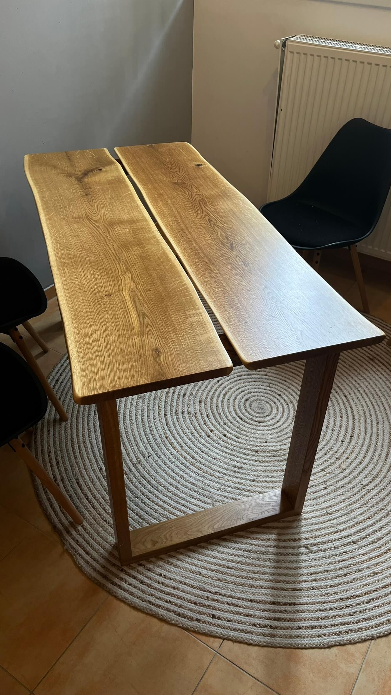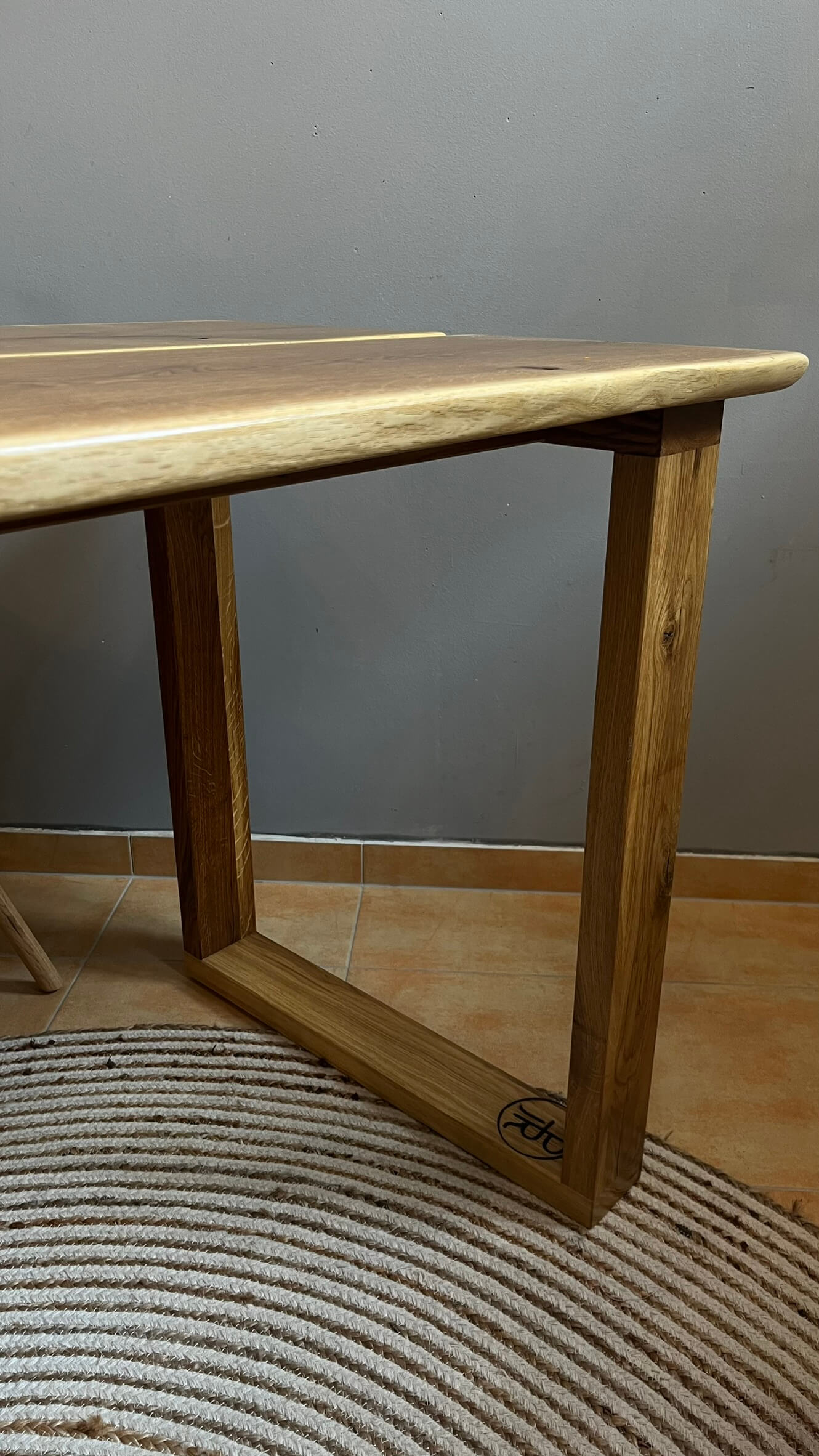 Minimalistický stůl navržený do menšího bytu. Deska tvořená dvěma „live edge“ dubovými fošnami bez středové výplně nechává vyniknout přirozenou kresbu i tvar dřeva. Podnoží z masivního dubu v jednoduchém čtvercovém rámu doplňuje celkový čistý a vzdušný vzhled.