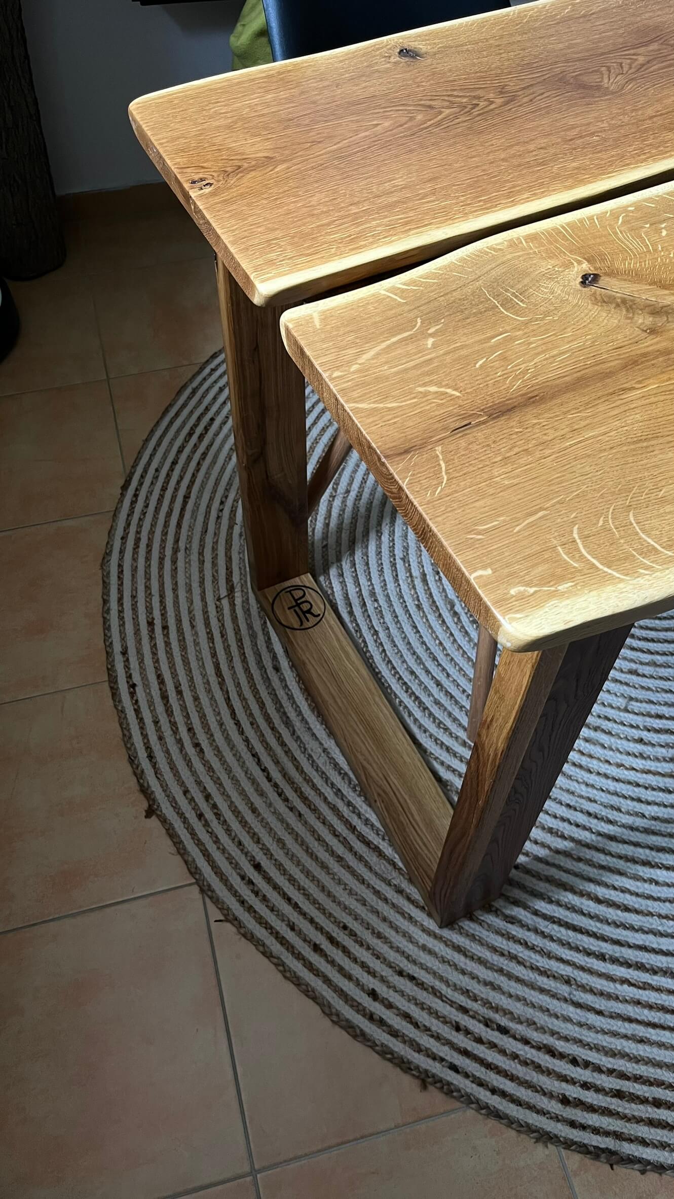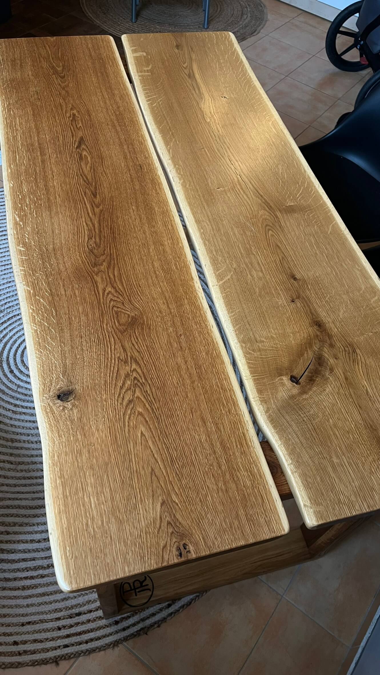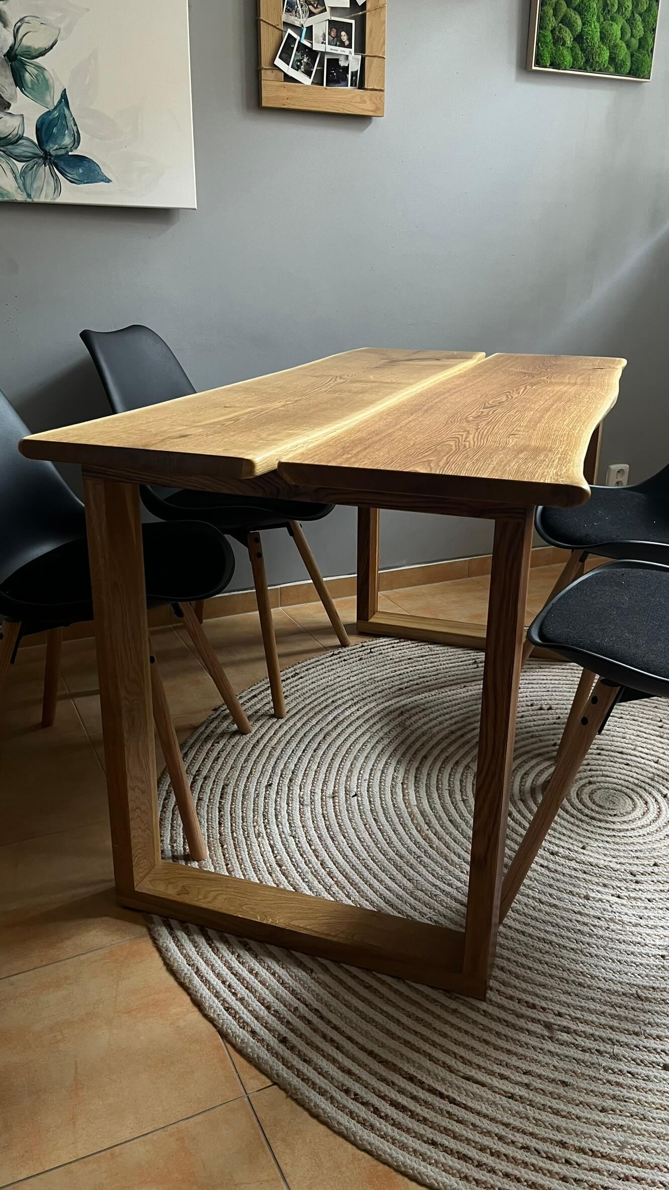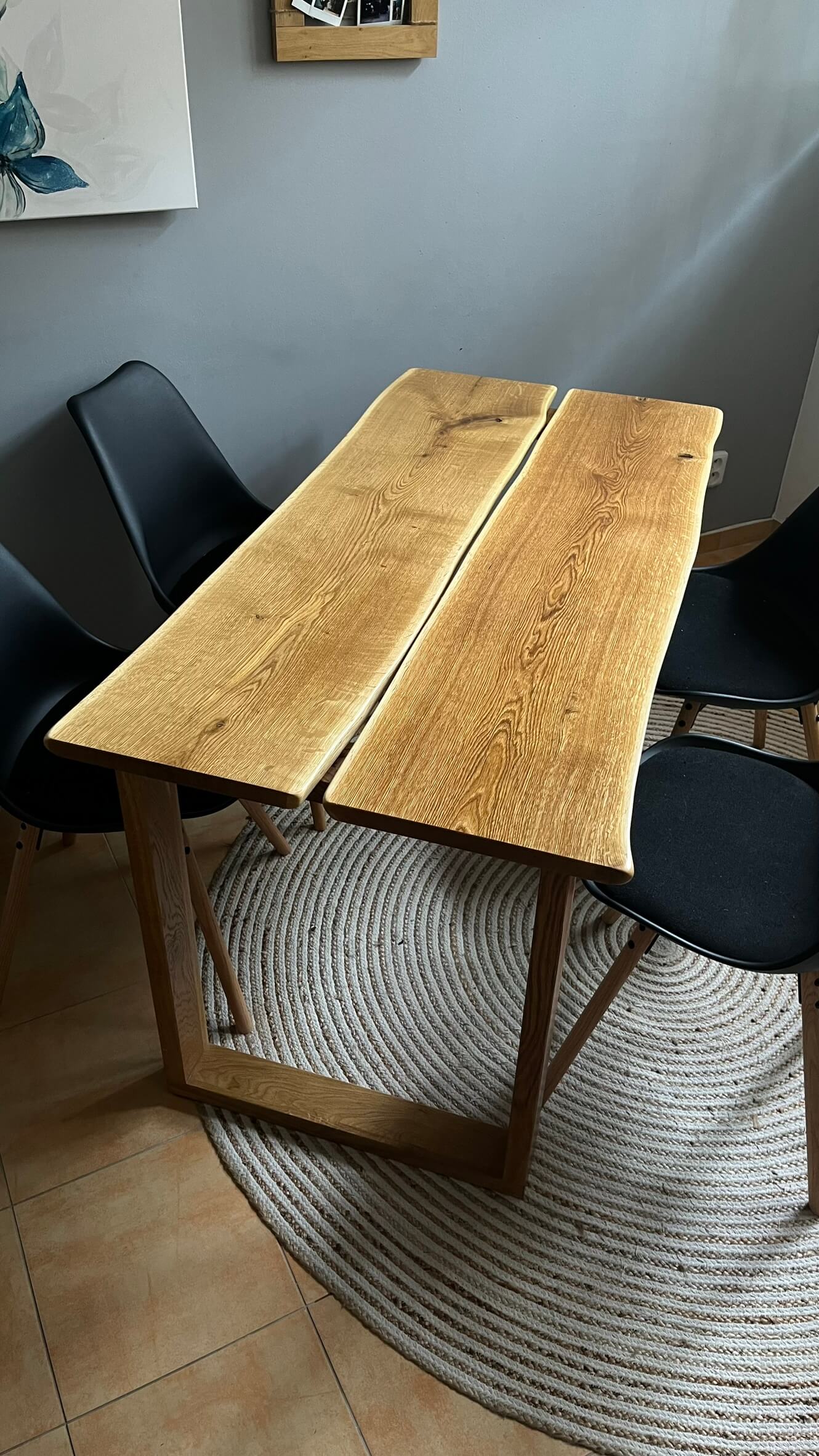 Minimalistický stůl navržený do menšího bytu. Deska tvořená dvěma „live edge“ dubovými fošnami bez středové výplně nechává vyniknout přirozenou kresbu i tvar dřeva. Podnoží z masivního dubu v jednoduchém čtvercovém rámu doplňuje celkový čistý a vzdušný vzhled.